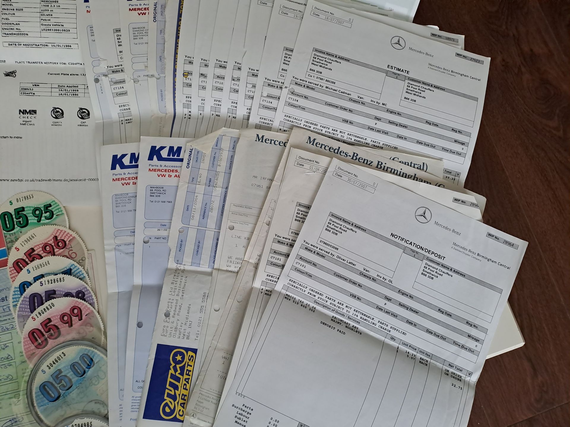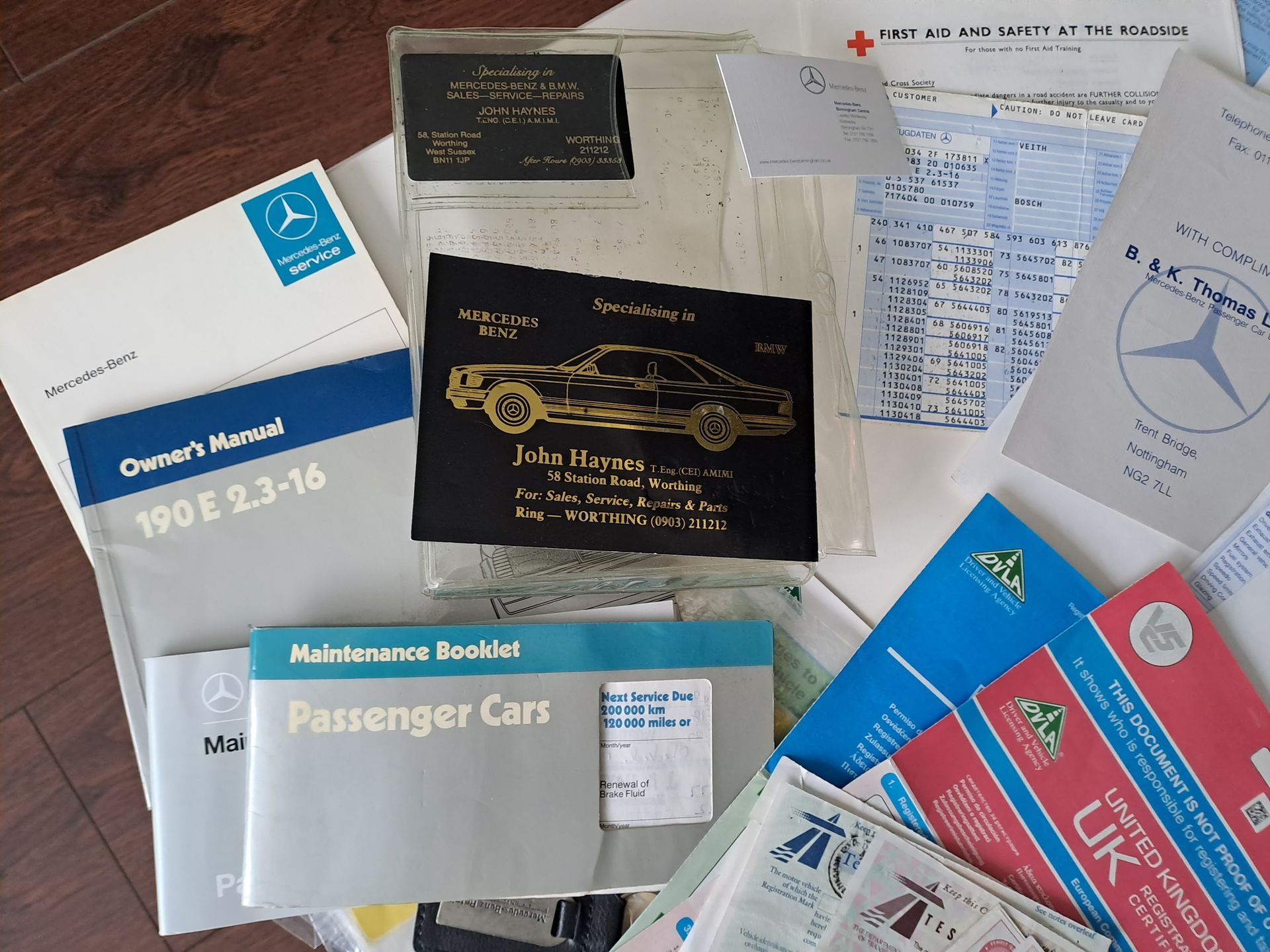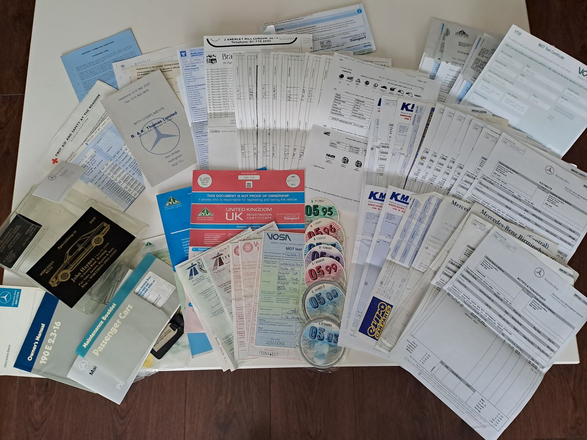 This 2.3-16 comes with a decent amount of paperwork, comes with the handbook/owners manual with the wallet, some old Mercedes brochures, all the previous MOts last one in 2007 when it was parked up, Old tax disks from 1995, has a sale bill from 1987 when the car was a year old, the original factory build card, Full service book last one at 2005 and lots of invoices/receipts.