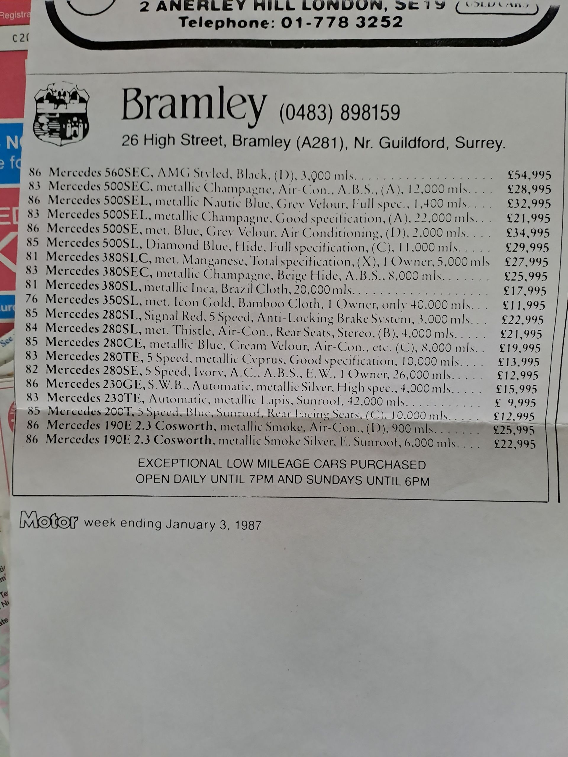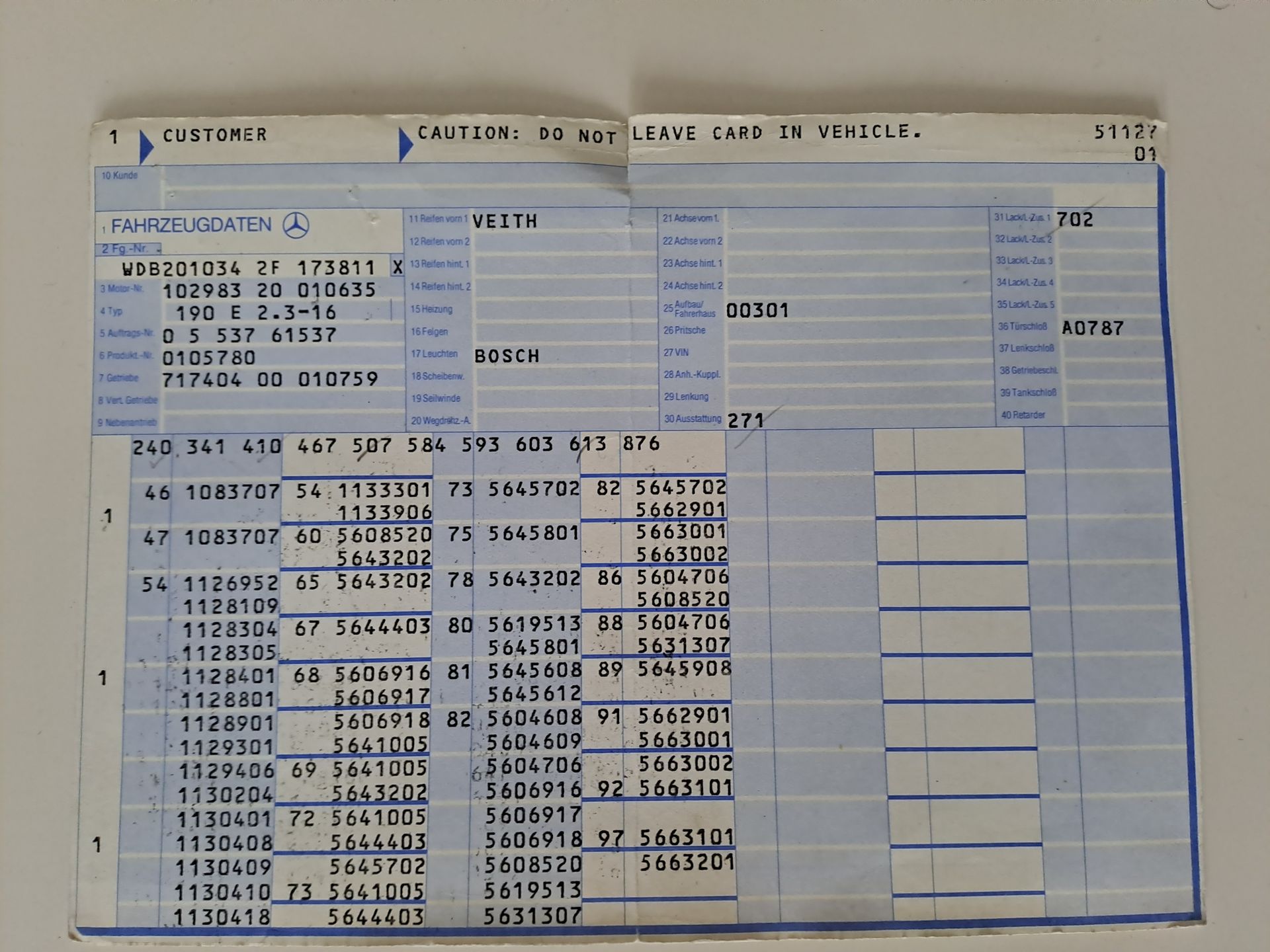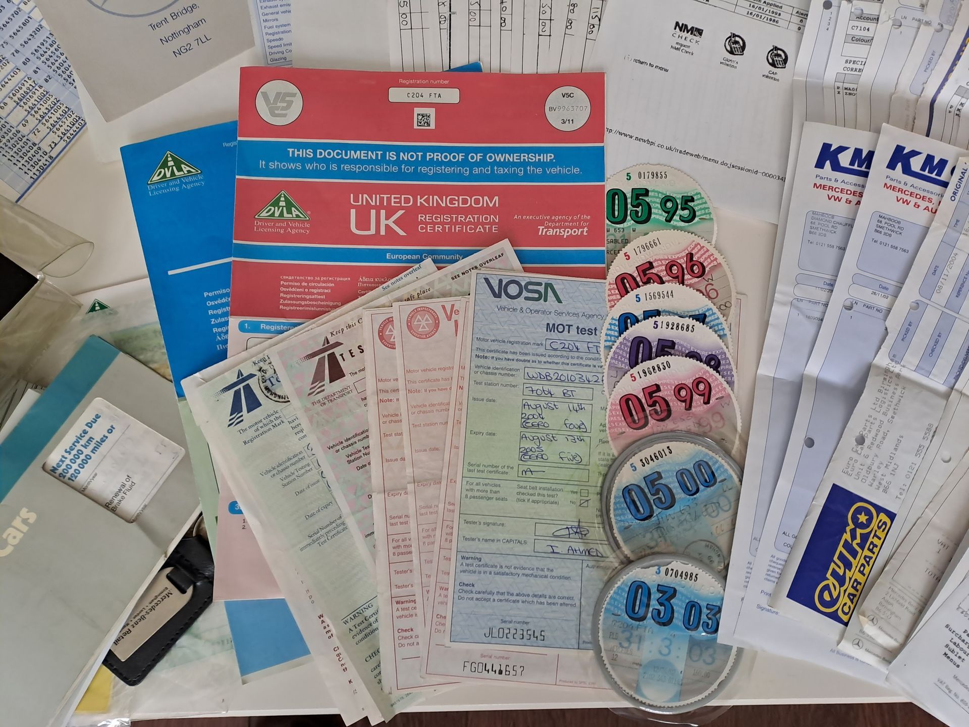 This 2.3-16 comes with a decent amount of paperwork, comes with the handbook/owners manual with the wallet, some old Mercedes brochures, all the previous MOts last one in 2007 when it was parked up, Old tax disks from 1995, has a sale bill from 1987 when the car was a year old, the original factory build card, Full service book last one at 2005 and lots of invoices/receipts.